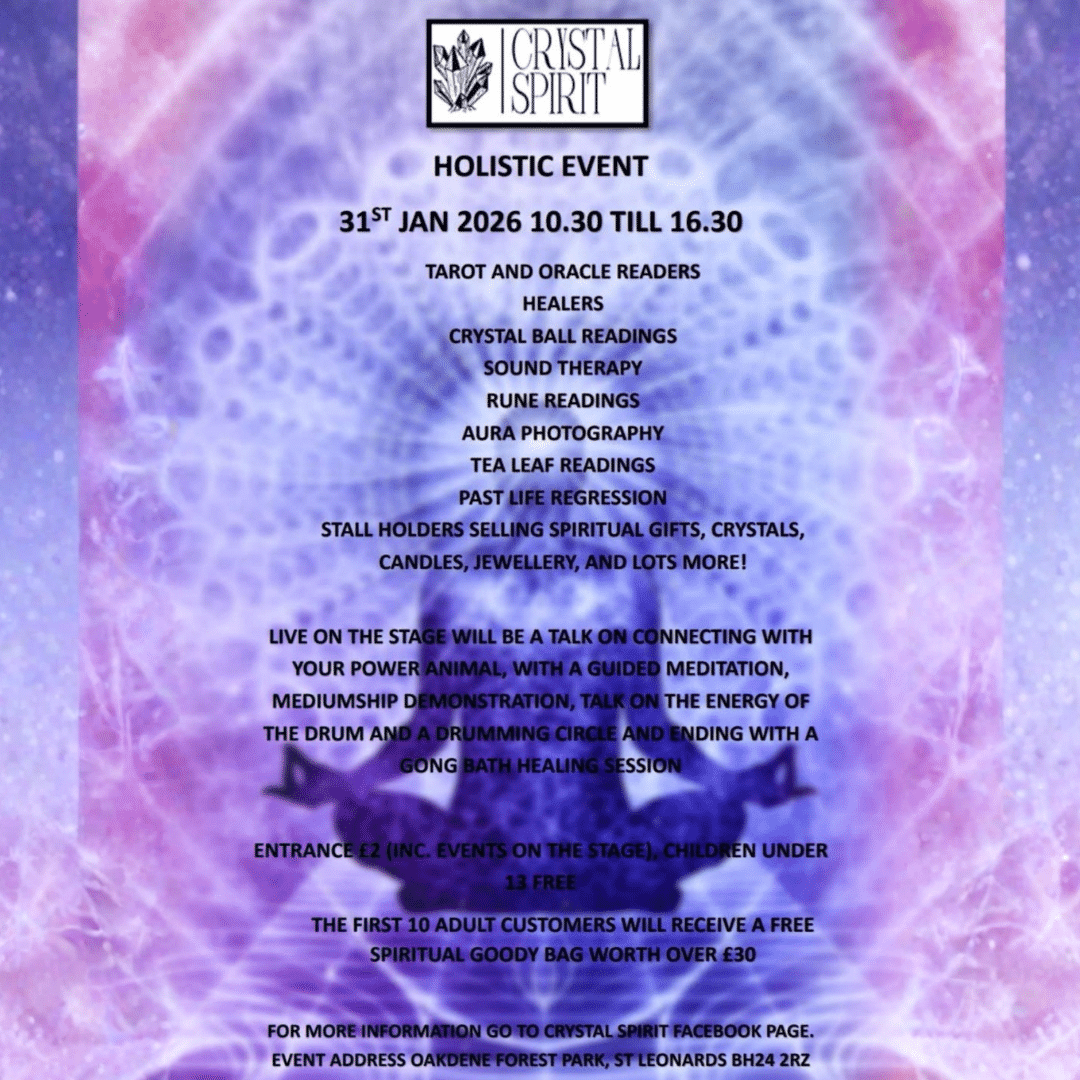 Tarot & Oracle Readers Healers Crystal Ball Readings Sound Therapy Rune Readings Aura Photography Stalls with spiritual gifts, crystals, candles, jewellery and lots more