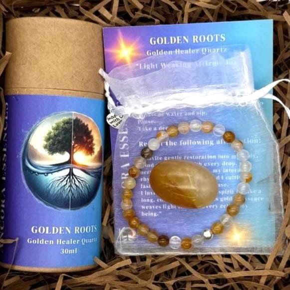 The Golden Roots Anchoring Box is a softly curated experience designed to bring you back into your body, your breath, and your inner steadiness. This ritual weaves together the power of nature through essence, crystal energy, touch and guided meditation to support deep grounding and nervous system calm.